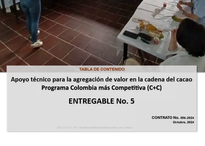 El documento es el Entregable No. 5 del proyecto de Apoyo técnico para la agregación de valor en la cadena del cacao, desarrollado por la Fundación Carlota en el marco del Programa Colombia más Competitiva (C+C). El objetivo general del proyecto es diseñar y/o ajustar los procesos de producción y transformación de cacao y productos semielaborados para mejorar la rentabilidad de los actores de la cadena productiva, basándose en los requerimientos de la demanda internacional (prioridad al mercado europeo y/o suizo).