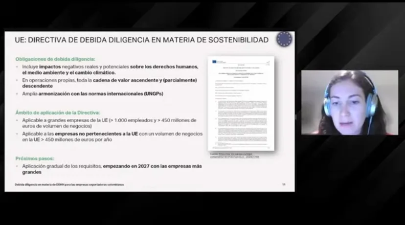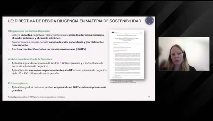Posteriormente, Mary Amalia, representante de SIPPO Colombia, presentó herramientas desarrolladas por este programa, por el ITC y ProColombia, que pueden ser de utilidad para los empresarios exportadores en este proceso. Finalmente, Regula Meng, de FocusRight, abordó la temática de los derechos humanos y presentó material práctico para facilitar la implementación de los requerimientos en esta materia.